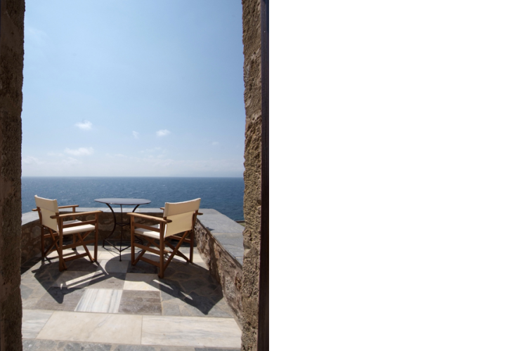 Φιλόξενο δωμάτιο με βεράντα που προσφέρει στον επισκέπτη πανοραμική θέα στη θάλασσα, το ανατολικό τμήμα των τειχών του κάστρου και τον οικισμό.