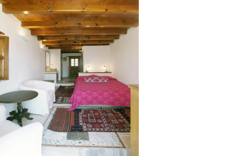 Cosy room that opens to a private balcony with a panoramic view to the sea, the eastern part of the castle walls and the village. It accommodates two guests in a double bed.