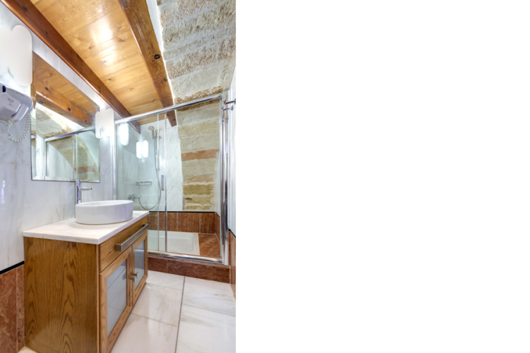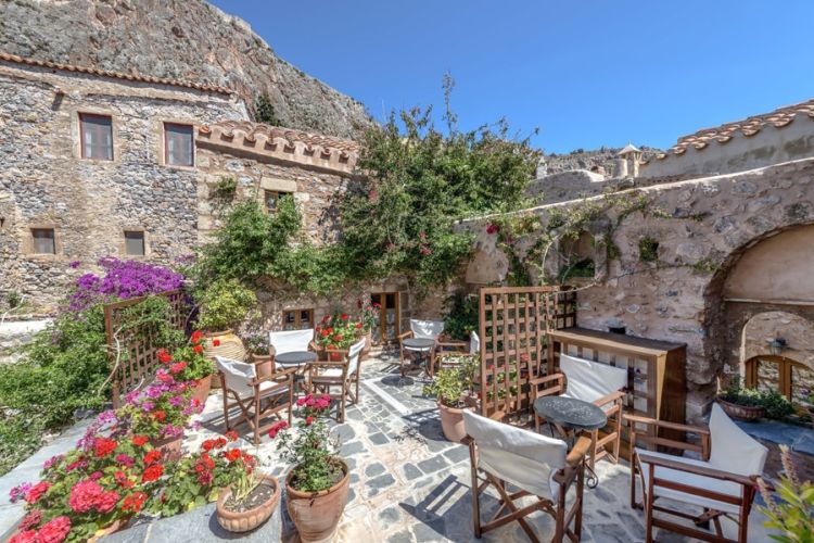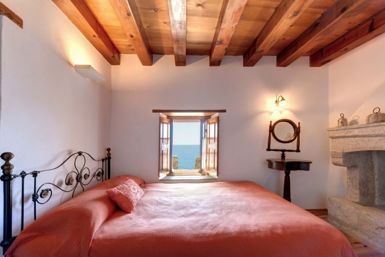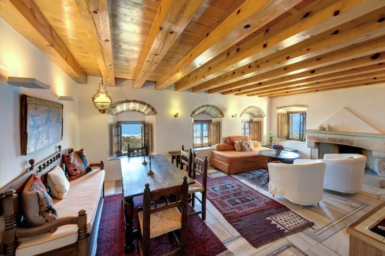 Description: | The apartment is located on the first floor and has two impressive fireplaces or tzakia, from which it takes its name. It opens to a large communal internal terrace, which offers a view back towards the rock and the village. All the rooms have windows with sea views. It features a large living room, two bedrooms, two bathrooms, and a well-appointed kitchenette equipped with electric hobs, refrigerator, electric kettle, coffee maker and various utensils. The apartment can accommodate up to five guests, two adults in a double bed, two adults in twin beds and a child on a sofa bed in the living room at an extra charge. |